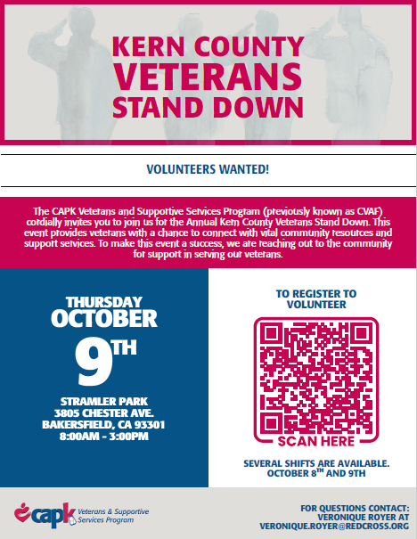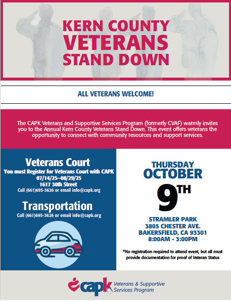 This year’s Stand Down will be held on Thursday, October 9, 2025, from 8:00 AM to 3:00 PM at Stramler Park, 3805 Chester Ave., Bakersfield, CA. While no pre-registration is required to attend, attendees must provide documentation of veteran status. Veterans Court registration with CAPK will be available prior to the event, along with transportation options for those in need.